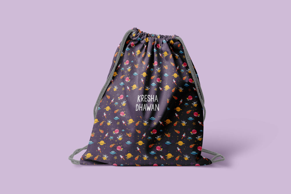 Carry the cosmos with you on this space-themed drawstring bag, adorned with celestial elements.