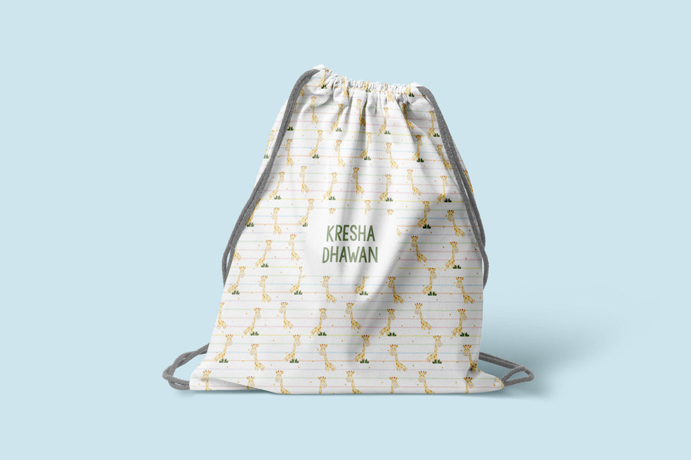 These drawstring bags bring a splash of playful charm, featuring animated whimsical giraffes that come to life in their striped wonderland.